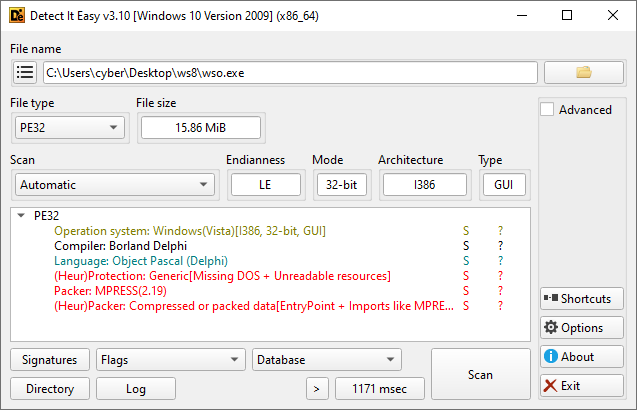 Commençons par inspecter « wso.exe » en le scannant avec DiE