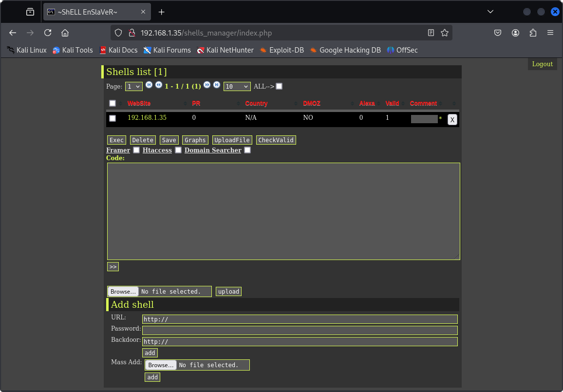 « Shell Enslaver » est une application PHP destinée à centraliser et piloter des webshells déployés sur des serveurs compromis. L’interface épurée permet à l’attaquant de facilement ajouter ou importer des webshells. Il est ensuite possible de sélectionner des webshells afin d’exécuter des commandes, d’uploader des fichiers, de vérifier la validité des backdoors ou encore d’utiliser des modules complémentaires comme :