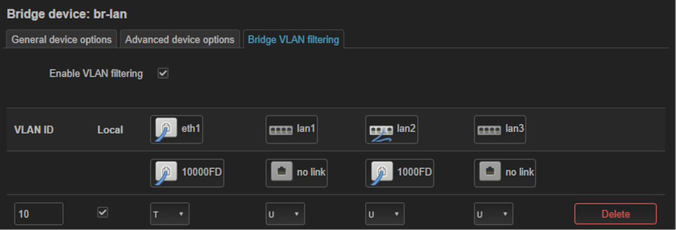 br-lan, avec les VLAN IDs 10 à 50 tagués sureth1(uplink switch) et non-tagués sur les ports locaux concernés.