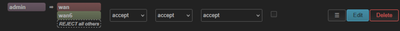Avant de créer l'interface, on crée d'abord la zone firewall qui lui sera associée. Dans Network → Firewall, ajoutez une zone admin avec les permissions souhaitées (cf. screenshot — zone admin forward vers wan et wan6).