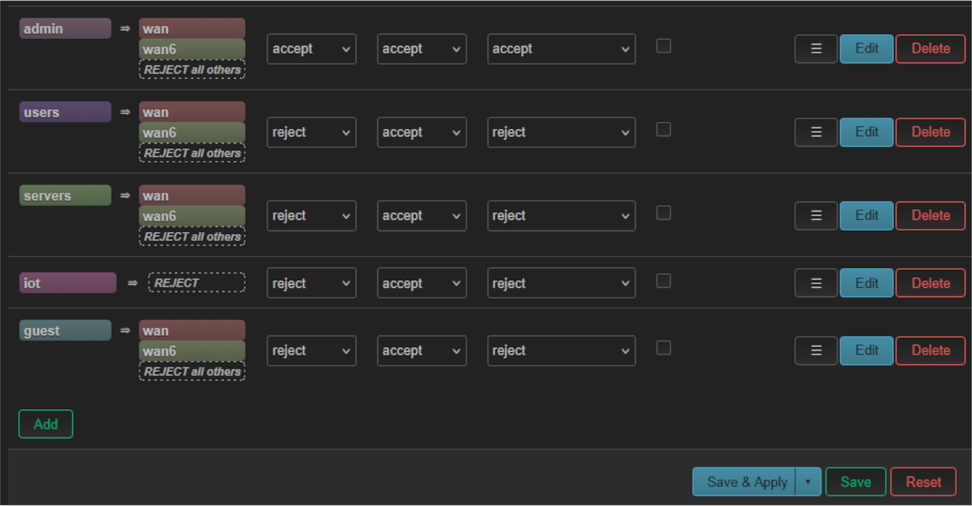 - Firewall zones : chaque zone a ses règles de forwarding adaptées (admin → tout, guest → wan uniquement, iot → isolé).