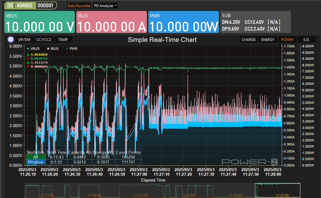 Retex de la séance improvisée de l’association HackGyver du Jeudi 1er mai, 18h30 sur la mesure de performance électrique de nos appareils USBs. L’article qui suit utilise un Power-Z KM003C présenté lors du rendez-vous, utilisé pour diverses mesures.