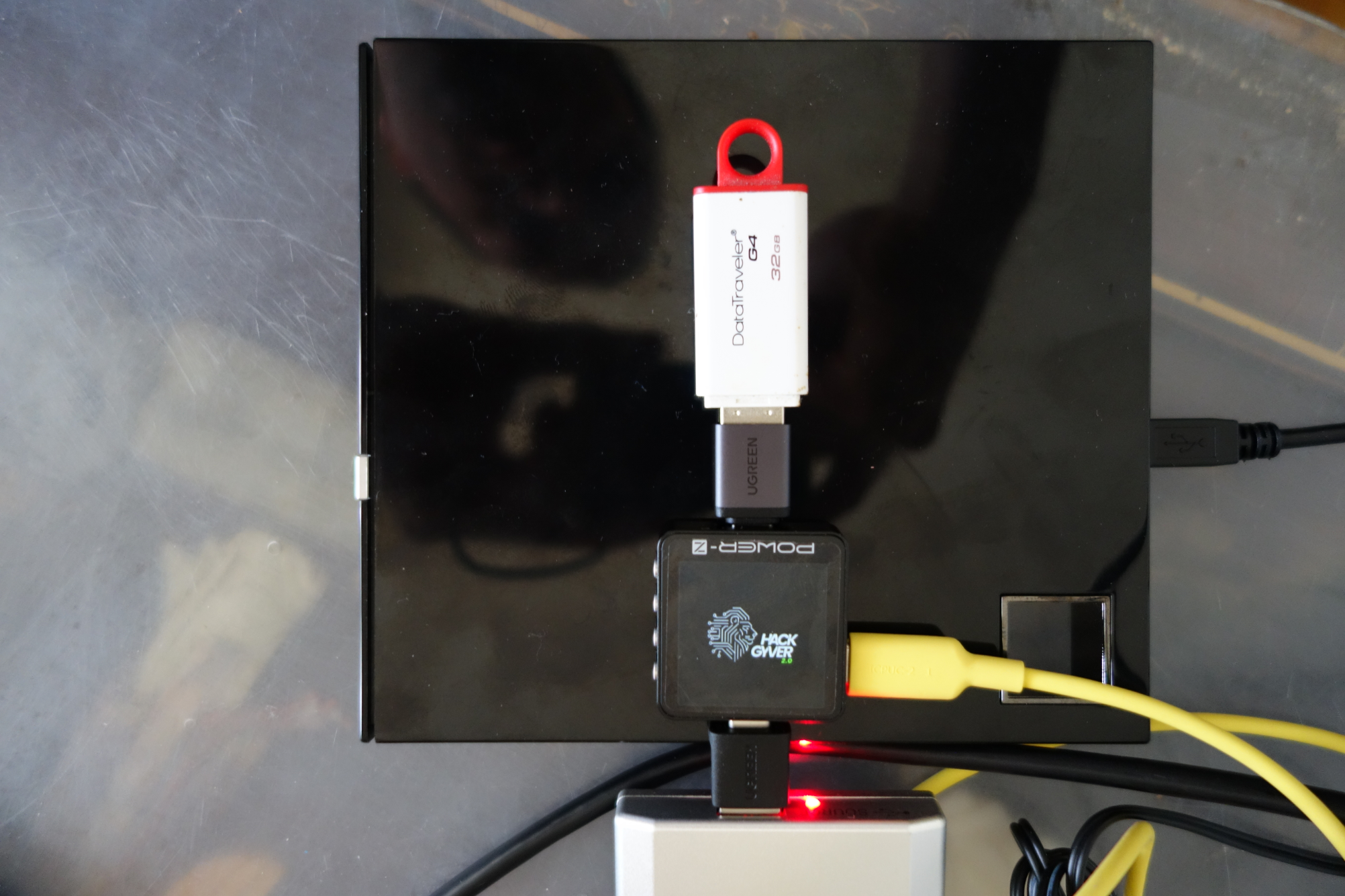 Même schéma de montage, le Power-Z se situe entre l’USB Stabilizer et notre clé USB. (une Kingston DataTraveler G4 de référence DTIG4)