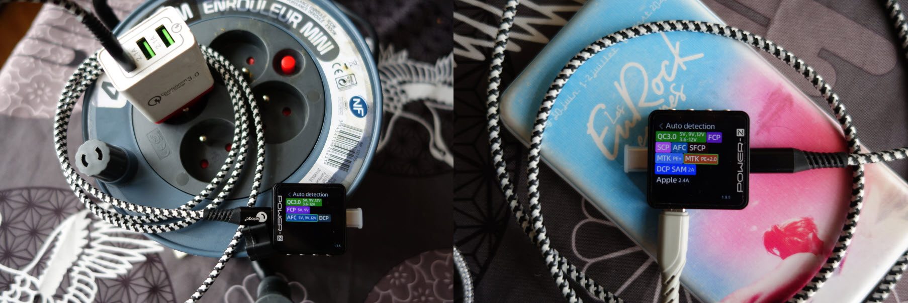 Toutes nos alimentations ne sont pas égales, voici un test avec un chargeur secteur Qualcomm Quick Charge 3.0 de référence KeKe-QC-04, contre une batterie externe à droite de chez Global Charger, référence Mega Mana 20 000mAh. Pour testé ça avec le Power-Z il suffit de se rendre dans le menu Application puis d’aller dans Charging protocol.