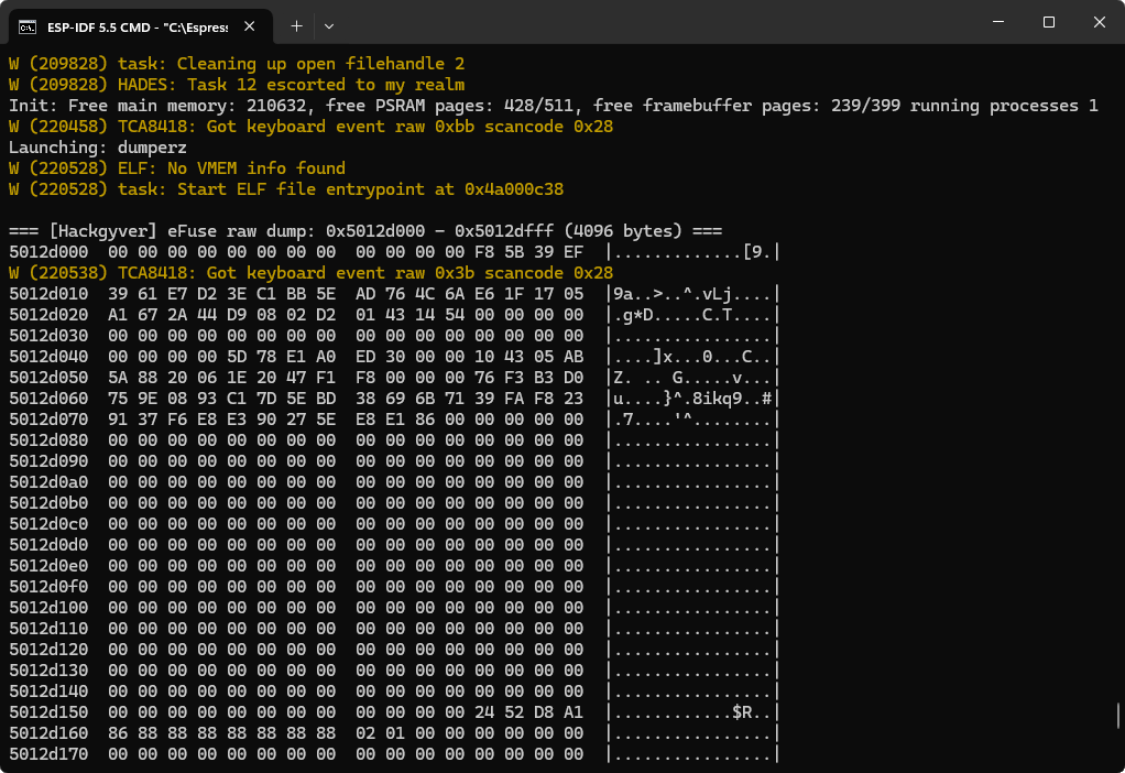 printf("\\n=== [Hackgyver] eFuse raw dump: 0x%08" PRIxPTR " - 0x%08" PRIxPTR " (%u bytes) ===\\n",