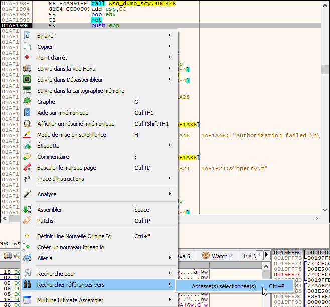Une fois à l’emplacement où il y a une référence à cette chaîne, on va se positionner au début de la procédure, à savoir sur le PUSH EBP puis on va chercher toutes les références vers l’adresse sélectionnée c’est à dire pour savoir d’où l’on vient et par quel moyen.