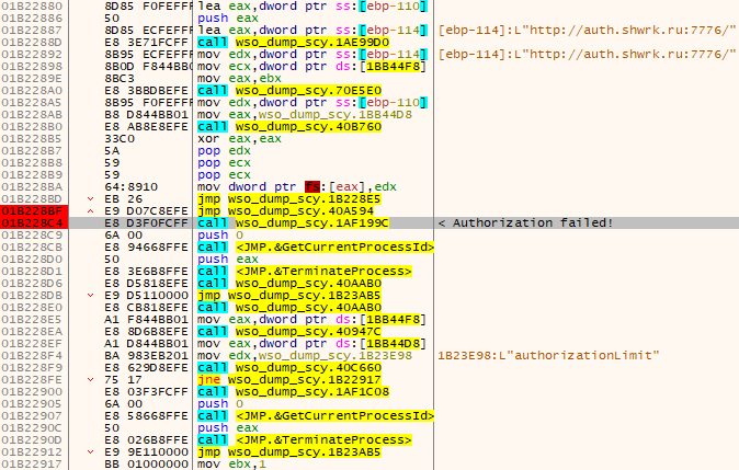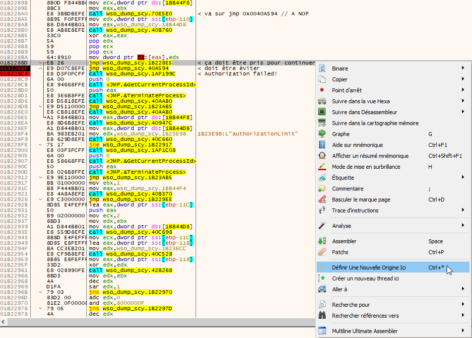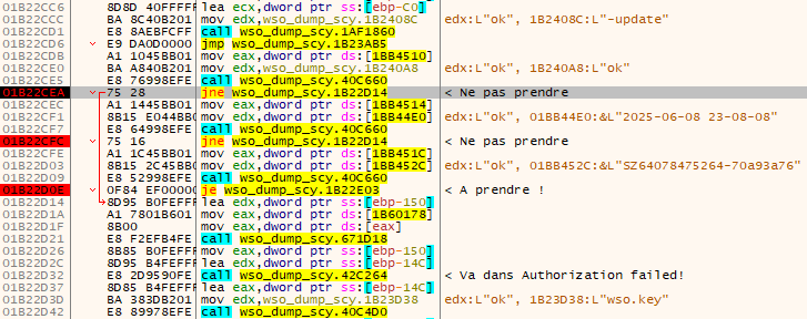 On poursuit le traçage jusqu’à rencontrer ce Jump if Not Equal. Celui-ci doit être absolument pris sinon un second message de refus en lien avec une autorisation échouée pour cause d’expiration s’affiche.