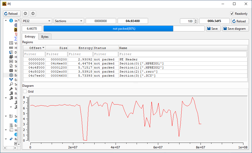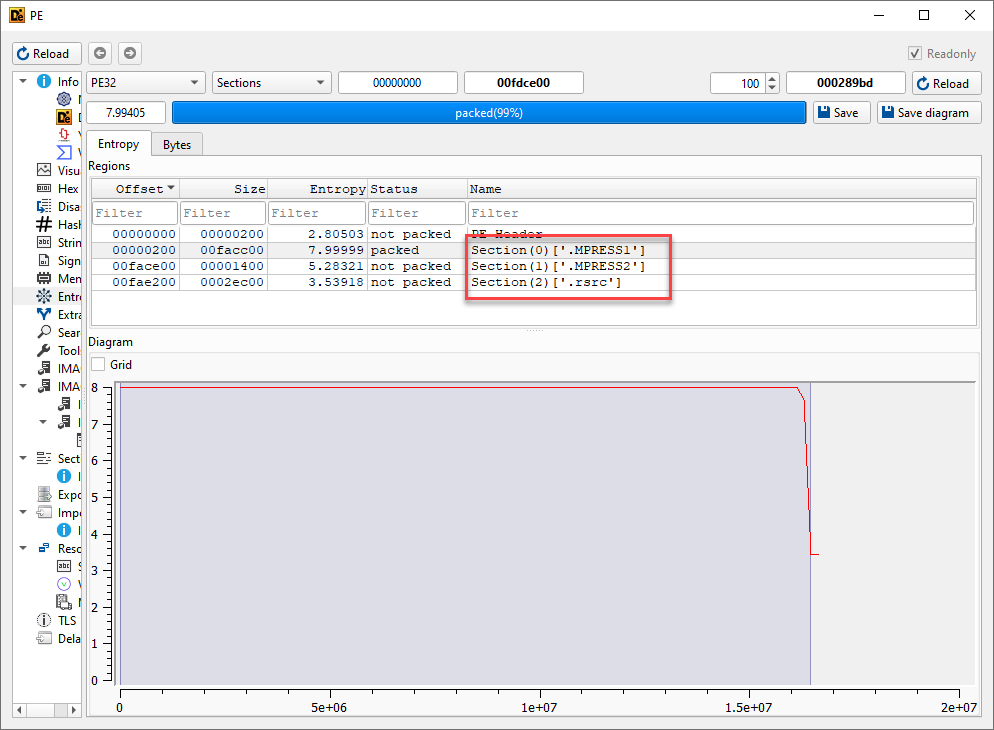 Sur l’interface DiE, si l’on clique à droite pour cocher « Advanced » et que l’on regarde l’entropie, on observera sous les sections .MPRESS1 & .MPRESS2 que le diagramme de l’entropie nous confirme clairement que l’exécutable est compressé.