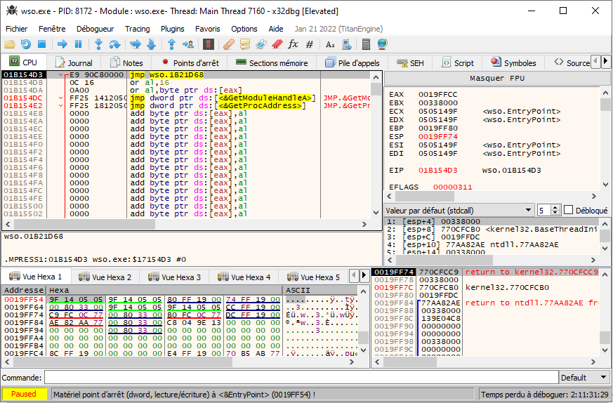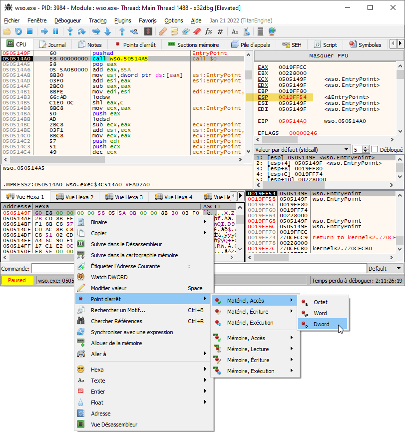matériel en accès sur ce Dword (voir capture d’écran). Cette manipulation va permettre de s’arrêter lorsque MPRESS va finir
