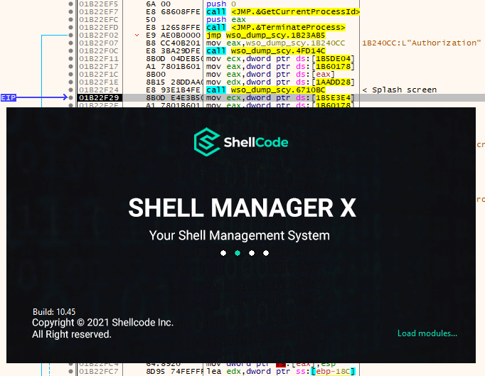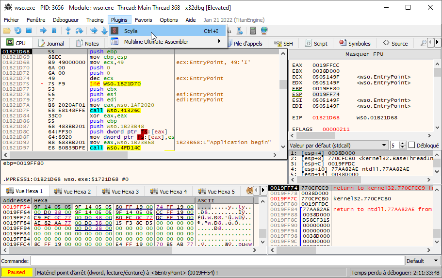 Lancer x32dbg / x64dbg puis faire glisser « wso.exe » sur l’interface afin de le charger.