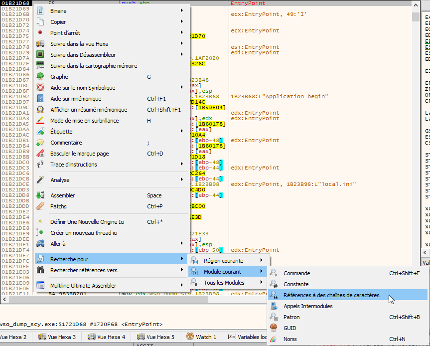 Désormais nous pouvons débugger convenablement. Charger votre exécutable de 76 Mo dans x32dbg / x64dbg. Effectuer ensuite un clic droit afin de chercher les références à des chaînes dans le module courant.