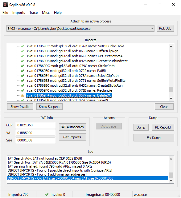 Fermer la boîte de dialogue puis cliquer sur le bouton « Get Imports » pour permettre à Scylla d’extraire la table des imports depuis la mémoire via toutes ces nouvelles informations.