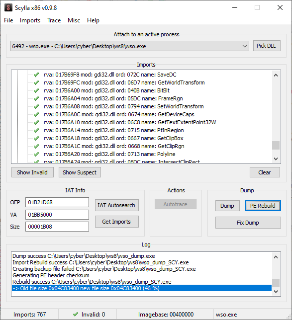 Une fois que les entrées problématiques sont corrigées / supprimées, cliquer sur le bouton « Dump » pour sauvegarder une copie mémoire de l’exécutable. Une fois le dump créé, cliquer sur le bouton « Fix Dump » pour corriger les anomalies restantes dans les sections. Enfin, cliquer sur le bouton « PE Rebuild » pour reconstruire les entêtes PE du fichier (sections, alignements, champs manquants, etc.) afin de rendre ce Portable Exécutable pleinement fonctionnel et compatible avec les outils d’analyse statique.