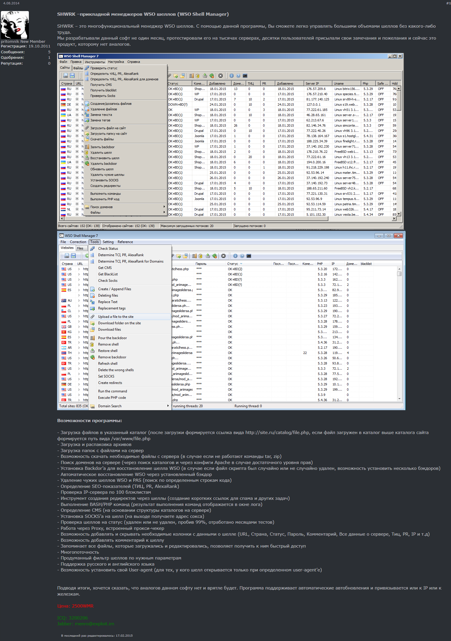 En poursuivant nos recherches de hacktools, nous avons identifié « WSO Shell Manager ». Cet outil payant, développé pour Windows par un russe, se distingue par son interface graphique soignée, des fonctionnalités avancées, et une logique d’industrialisation d’attaques à grande échelle. WSO est vendu via des forums russes orientés vers des pratiques illicites de Search Engine Optimisation, ce qui suggère une utilisation fréquente dans des campagnes malveillantes ciblant des sites web ayant un fort trafic pour du détournement ou de la monétisation ( BlackSEO, redirections sauvages, hébergements de contenus illicites, etc. ).