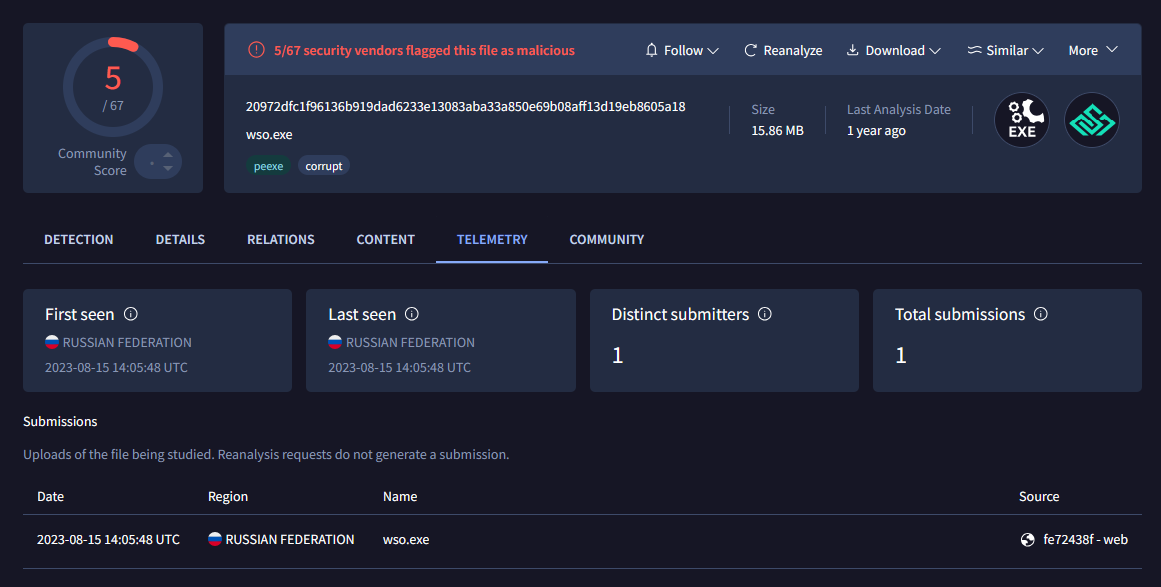 Quelqu’un en Russie a aussi scanné un fichier « wso.exe » en aout 2023, peu de temps après la sortie de la v10.45. Selon le