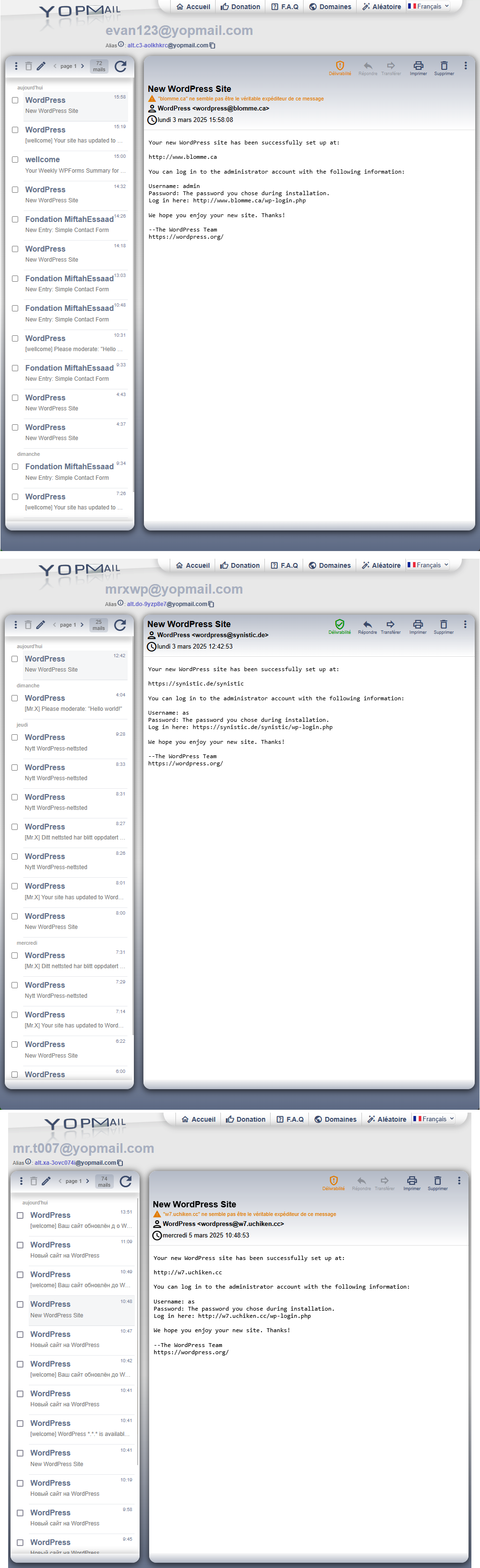 Jetons un coup d’oeil aux boites Yopmail. Sans surprise, on retrouve que des emails d’installation de WordPress, avec pleins d’autres domaines que l’on n’avaient pas dans les tables SQL: