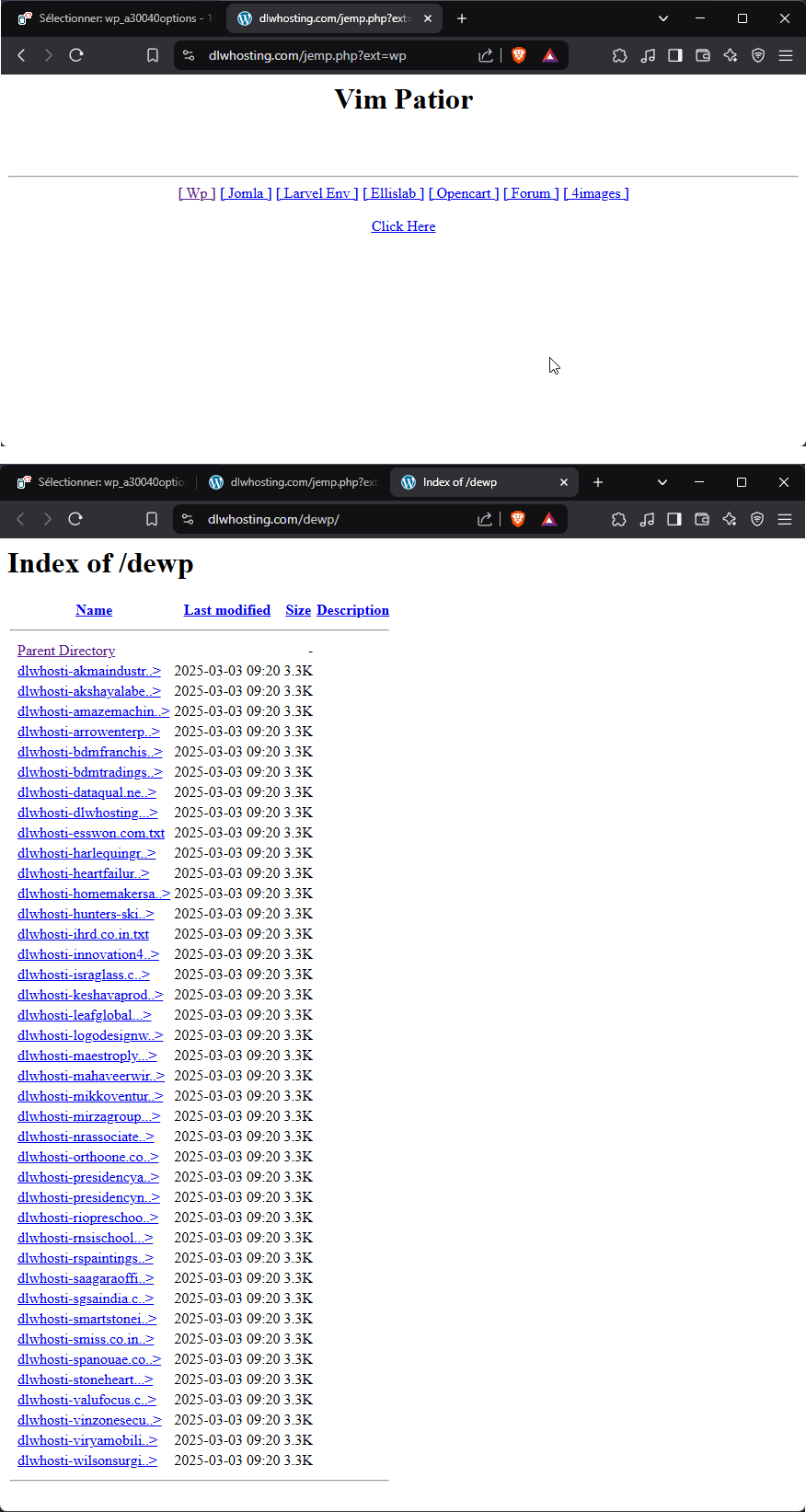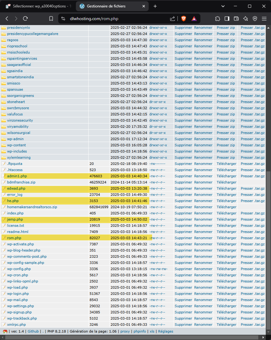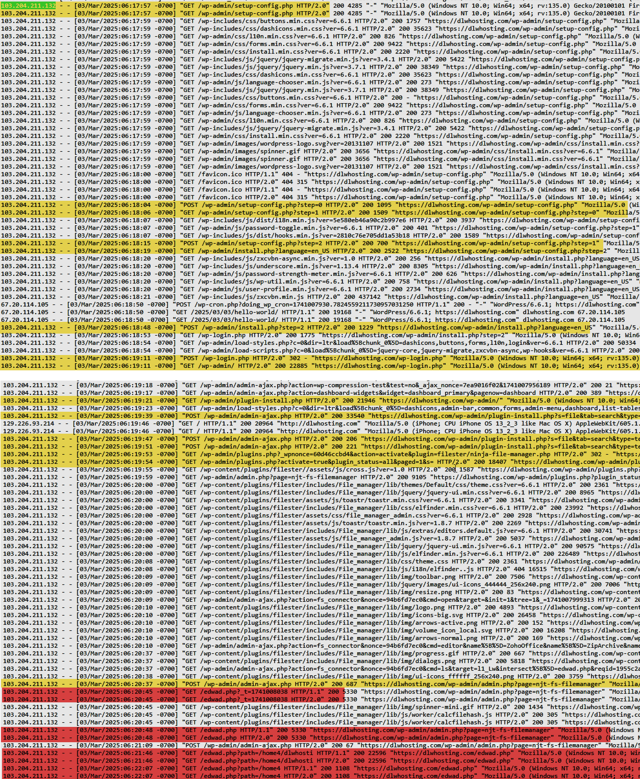 À ce stade, on ne sait pas grand-chose sur le ou les auteur(s). Les logs d’accès de « dlwhosting » indiquent que « 103.204.211.132 (Bangladesh) » installe malicieusement la base de données, puis installe le plugin de gestion de fichiers pour ensuite installer la porte dérobée « edwad.php » Un peu plus tard « 139.192.192.145 (Indonésie) » apparait et en drop quelques autres. logs dlwhosting