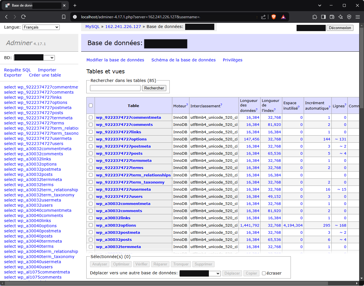 On essaye de se connecter à la base de données distante que l’attaquant a tenté de configurer sur notre honeypot. L’accès fonctionne correctement, on y retrouve dans la capture que des tables WordPress avec des préfixes différents, qui suggèrent que l’attaquant ne fait que des installations de WordPress :