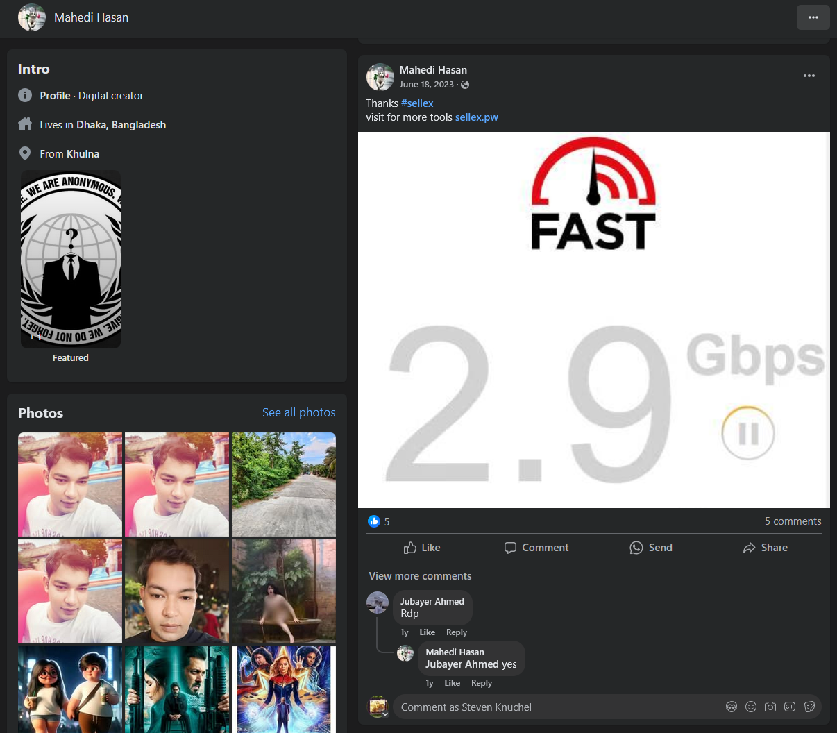 Alors avec un peu de recherches, on tombe sur son profile « facebook.com/Mahedi.hasan47 » En 2023, sur son mur, il fait référence a « sellex.pw », un site de black market pour pirates.