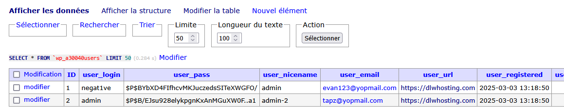 Bon OK il installe des WordPress... et après ? Créons-nous un compte « parasite » dans sa table pour aller jeter un coup d’oeil dans le WordPress...