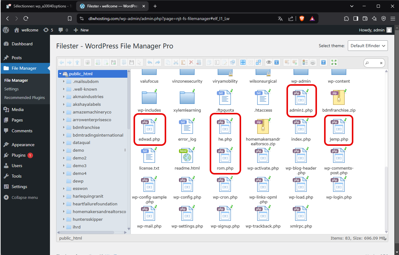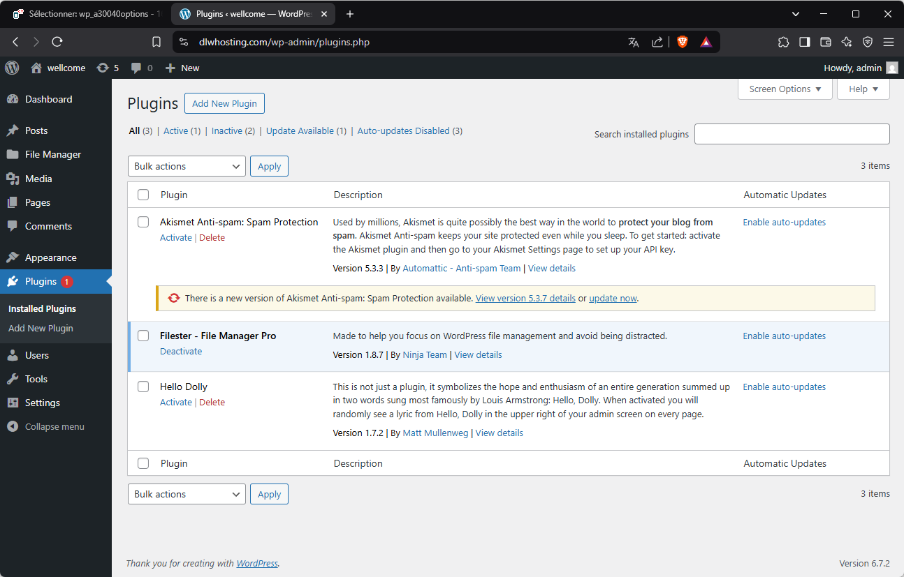Il y a une notification dans le menu « plugins », allons voir, il semble que le gestionnaire de fichiers pour WordPress « Filester - File Manager Pro » est le seul plugin d’activé.