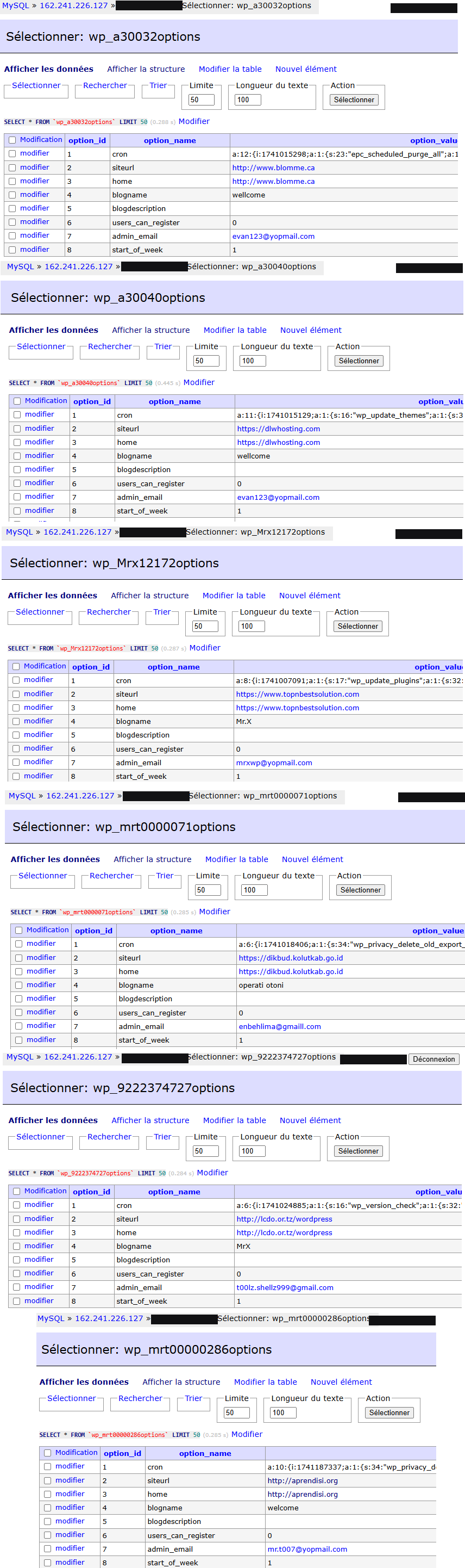 Voici maintenant une screenshot de chacun des premiers éléments des tables « options »: Plusieurs choses intéressantes pour nous, on a les domaines sur lequel l’installation a été réalisée, ainsi que les adresses mail utilisées pour créer les comptes administrateurs. L’attaquant utilise souvent dans ses configurations des WordPress trois adresses en « yopmail » :