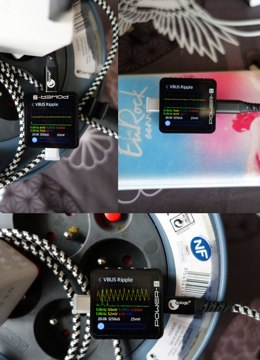 On y observe une ondulation VBUS relativement propre inférieure a 10 mV, signe de bonne régulation sur l’alimentation secteur Megaboom et la batterie externe Mega Mana. L’alimentation Qualcomm quant à elle présente une ondulation élevée ~50 mV, des dents de scie claires indiquant un bruit bien présent, signe d’un moins bon comportement à vide.