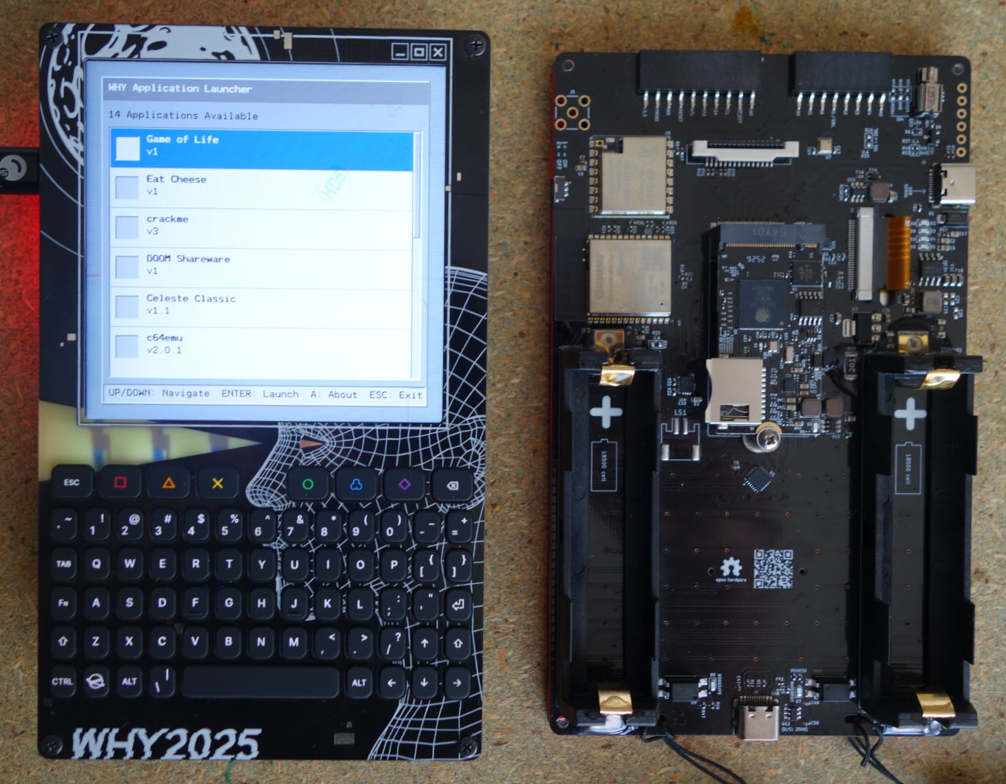 Le badge de la WHY2025 utilise un Espressif ESP32-P4-32MB, soit une architecture RISC-V. Le code du firmware ainsi que le hardware sont open source, la team badge nous fournit une SDK pour développer nos propres applications. Quelques applications sont aussi fournies de base dans le badge.
