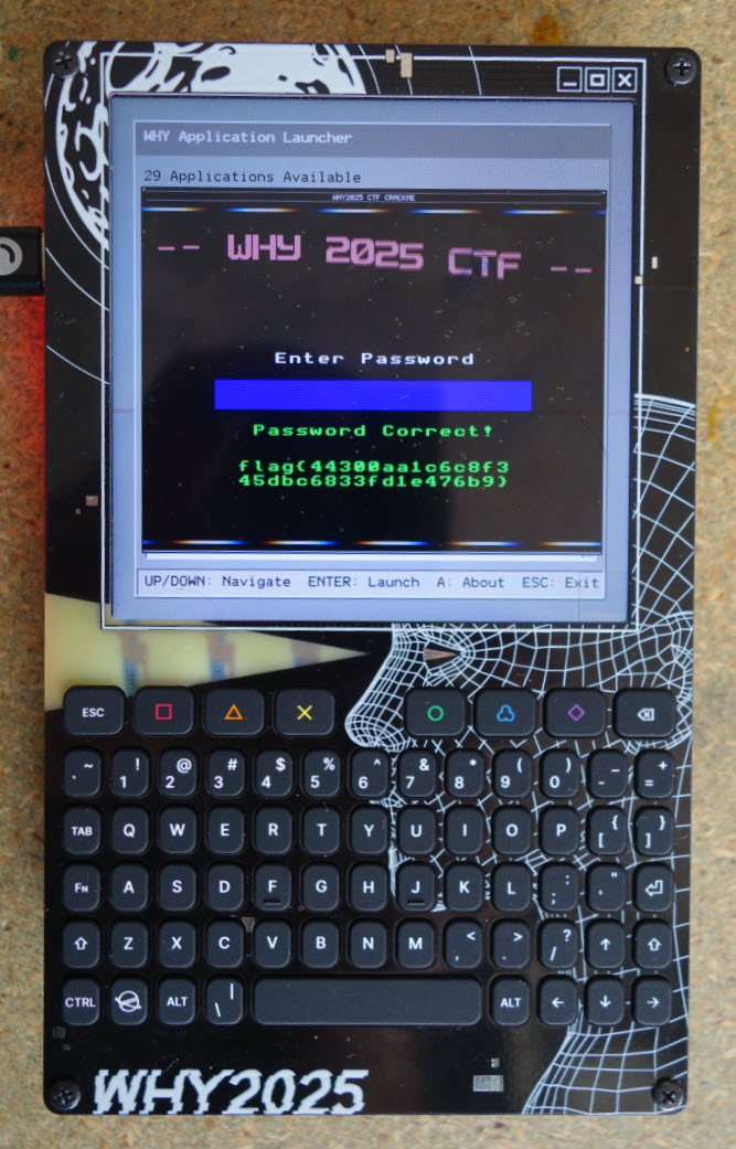 We found an ELF file you run on your shiny new WHY2025 badge. Can you figure out the password and get the flag?