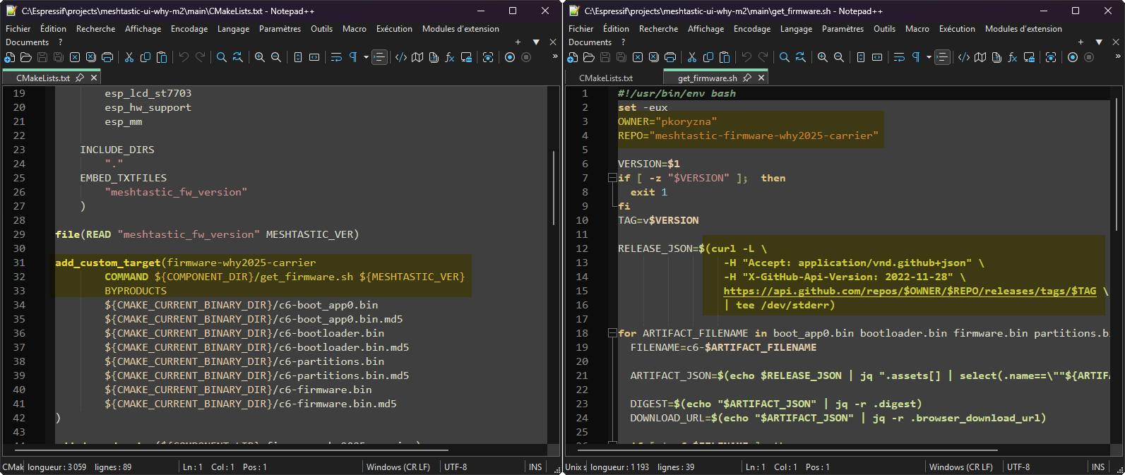 ⚠️ Pendant la compilation du projet pour le C4, le CMakeLists.txt de meshtastic-ui-why-m2\main\CMakeLists.txt a tendance a vouloir télécharger en arrière-plan le firmware précompilé du C6 depuis GitHub (on a besoin des blobs C6 pour compilé C4). Ce processus se fait automatiquement, sans que l’utilisateur en soit informé explicitement.